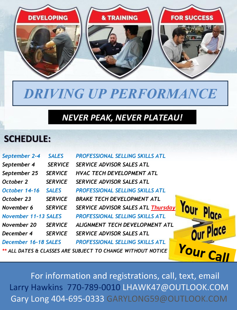 Driving Up Performance based in Hoover, AL offers the most comprehensive automotive sales classes to help you increase your sales and close more deals. We can also guide you if you’re seeking to improve your technical and customer service skills through our automotive service classes.